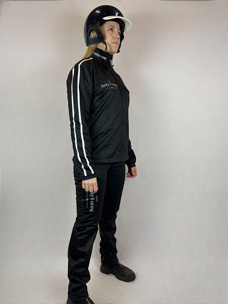 Detta snygga och funktionella stallset för kvinnor kan designas precis som din egen kostym eller skapas som ett gemensamt stallset i ägarens färger. Perfekt för både daglig användning och presentation på racerbanan, tillverkad av samma kvalitetsmaterial som många av våra andra produkter. Alla logotyper, namn och designelement ingår i priset.