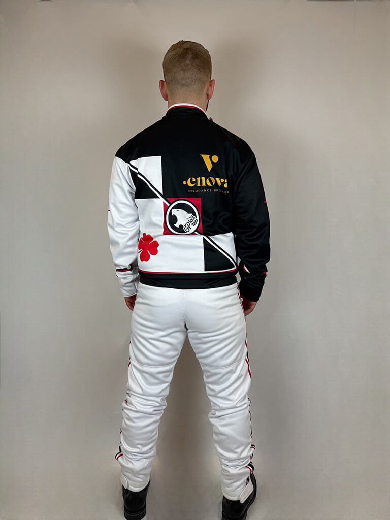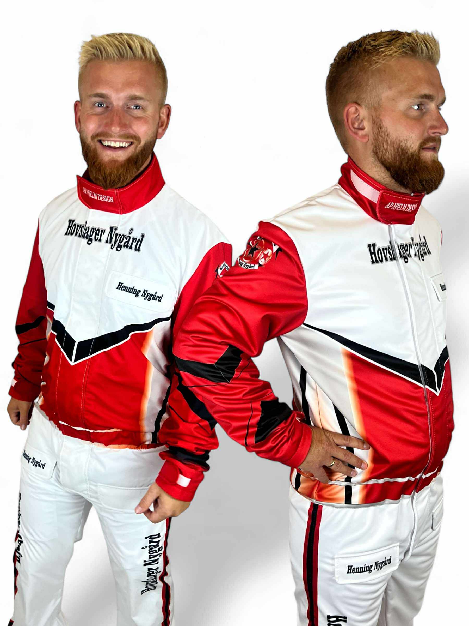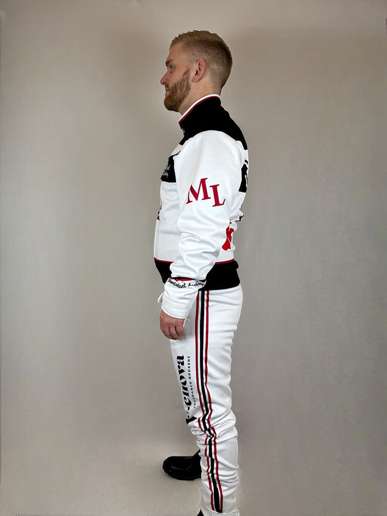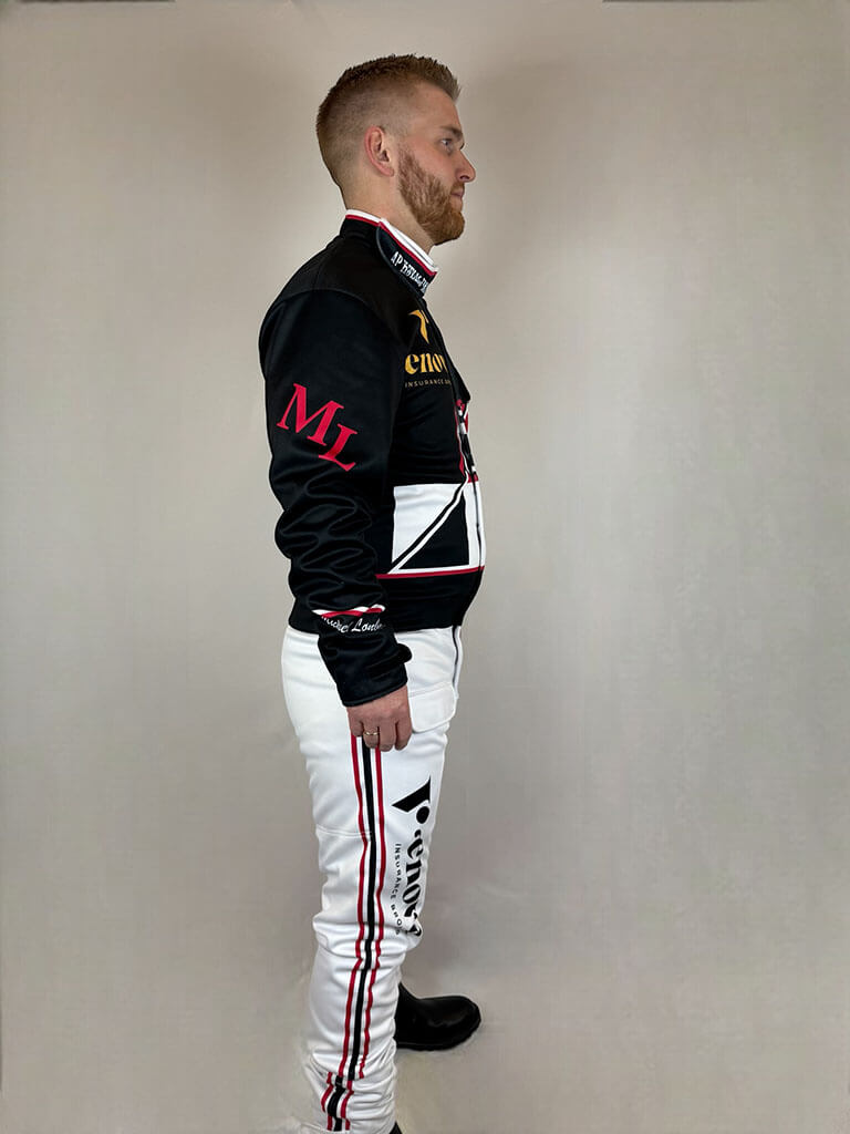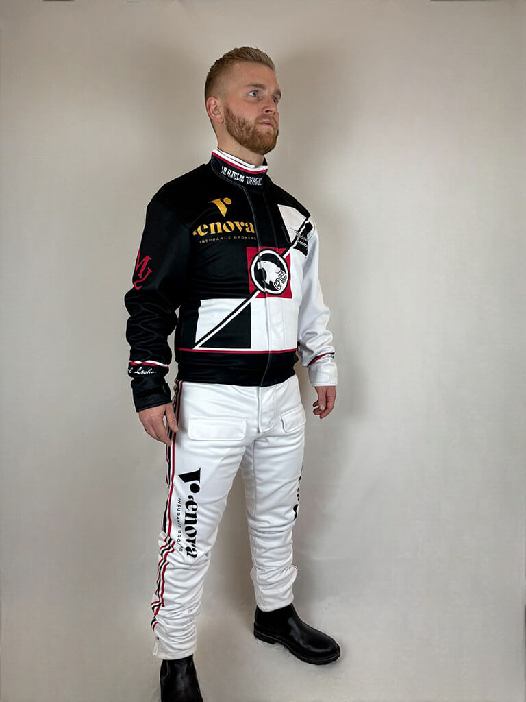 Dräkten är skapad för att passa den individuella föraren perfekt, vilket säkerställer optimal rörelsefrihet och komfort. Alla personliga designelement, som logotyper och namn, ingår i priset, så du får en unik och professionell kördräkt utan extra kostnad. Perfekt för både träning och tävling i alla väder!